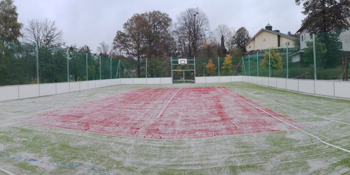 Právě dokončujeme hřiště v Tiché. Víceúčelové hřiště s hliníkovým mantinelovým systémem, umělým trávníkem a ochrannými sítěmi z polypropylenu 45/3mm. Součástí oplocení jsou vestavěné branky se vstupy.